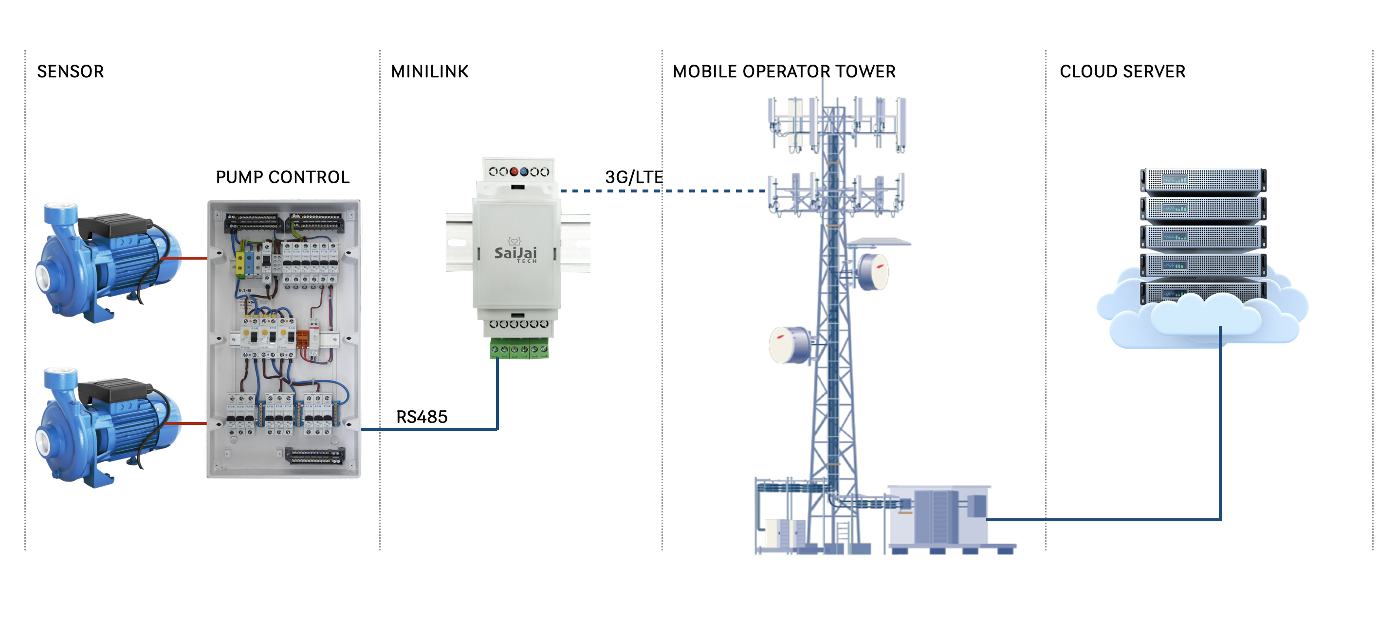 2) ใช้โหนด MiniLink IIoT ควบคุมปั๊มน้ำหลายตัวทางไกลผ่าน 3G/LTE
