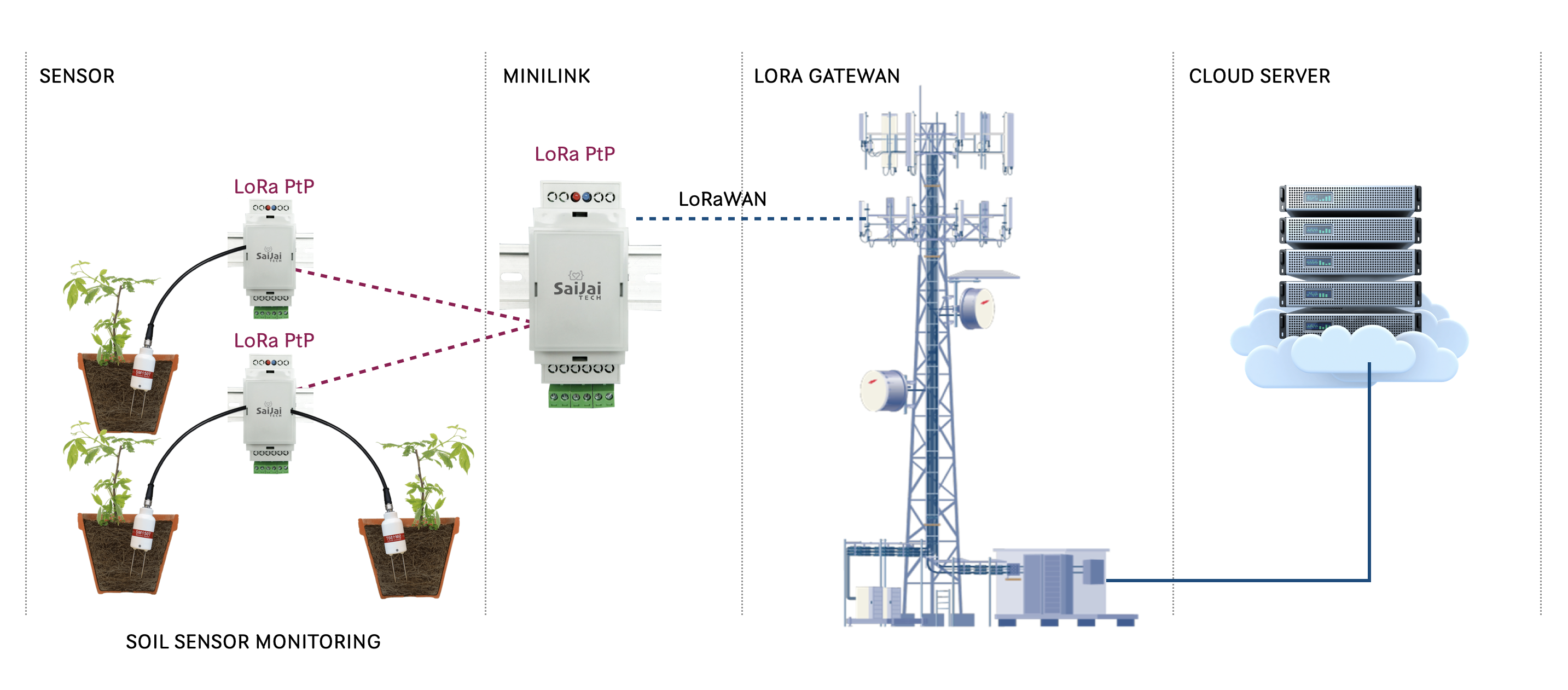 5) ใช้โหนด MiniLink IIoT อ่านค่าเซนเซอร์วัดความชื้นในดินหลายตัวโดย LoRa PtP แล้วอัพลิงค์ข้อมูลผ่าน LoRaWAN