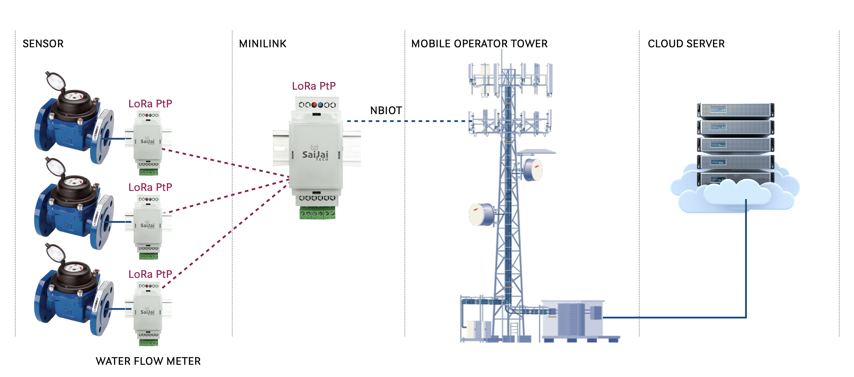 4) ใช้โหนด MiniLink IIoT อ่านค่าสมาร์มโฟลว์มิเตอร์หลายตัวโดย LoRa PtP แล้วส่งอัพลิงค์ข้อมูลผ่าน NB-IoT