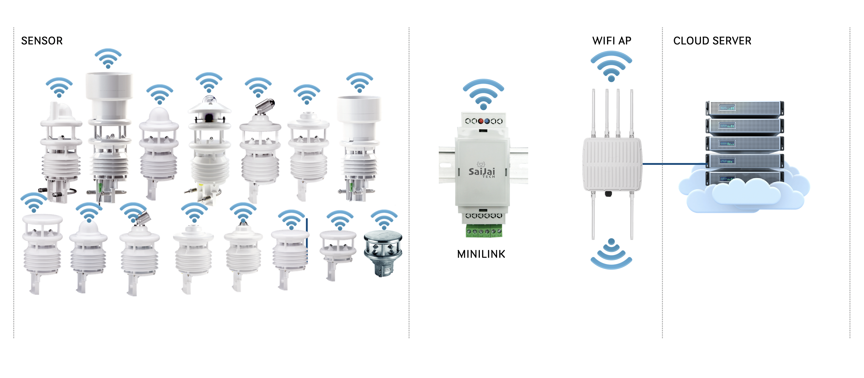 7) ใช้โหนด MiniLink IIoT อ่านค่าเซนเซอร์วัดสภาพอากาศโดย WiFi หรือ Bluetooth แล้วส่งอัพลิงค์ข้อมูลผ่าน WiFi