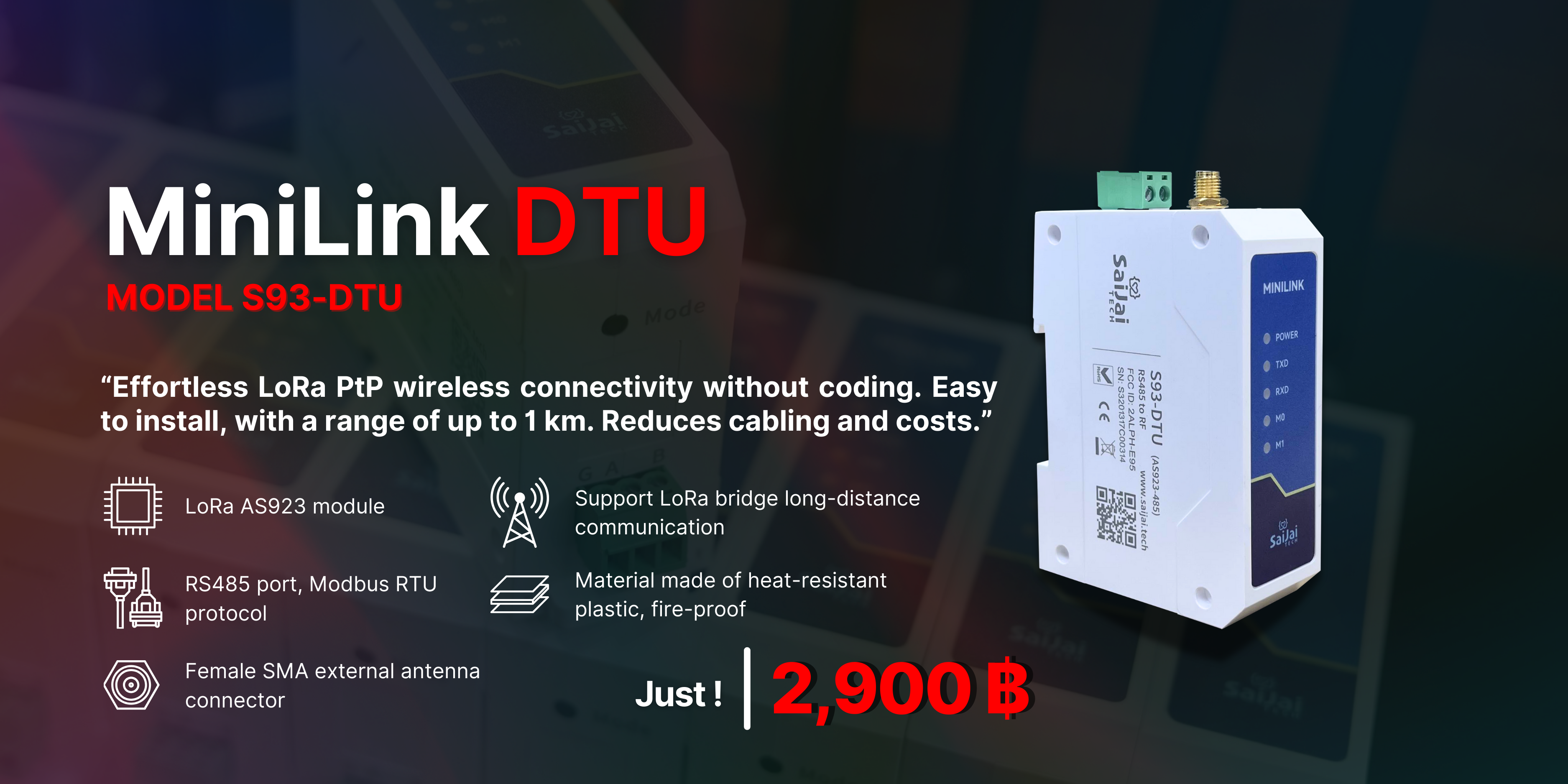 MiniLink DTU does not need to write code, does not need to configure, ready to use immediately. Communicates data from the RS485 port, transmits signals via LoRa PtP, the transmission distance is 1 kilometer. The working principle of the LoRa PtP bridge is to change from cable signal to wireless communication instead, which still supports the Modbus RTU protocol, reducing the cost of cable signal, and greatly reducing the installation cost. It is convenient to install it on the DIN RIAL rail immediately. The transmission distance is more than 1 km, even though the EIRP transmission power is set to only 14 dBm and uses an antenna with a small gain of 1.5 dBi.
